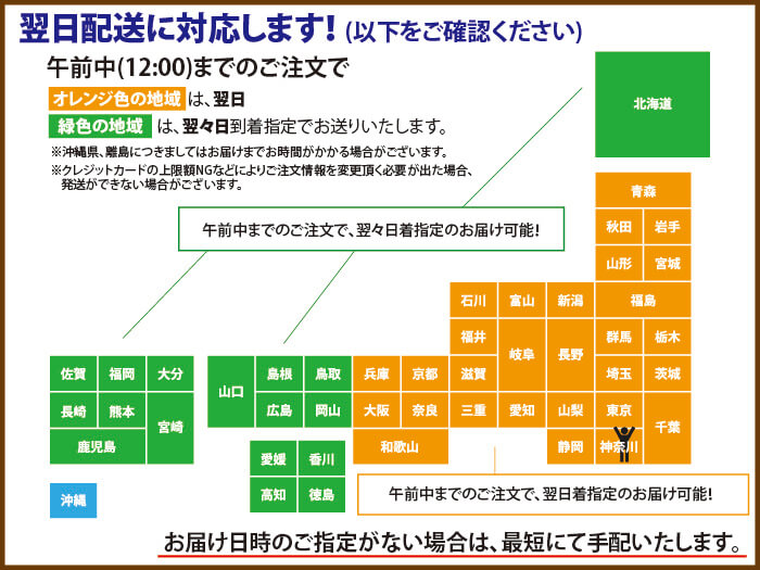 - 通常営業日(平日)の12:00まで のご注文分(決済完了分)は、当日出荷、それ以降は翌営業日出荷となります。