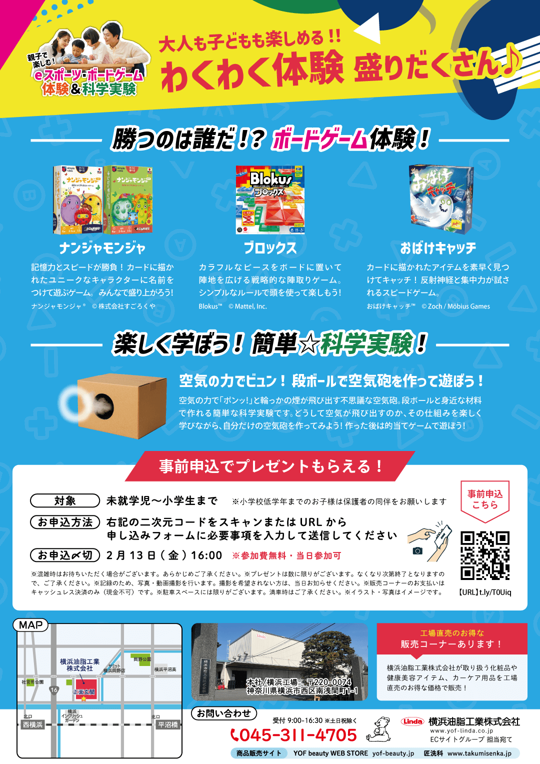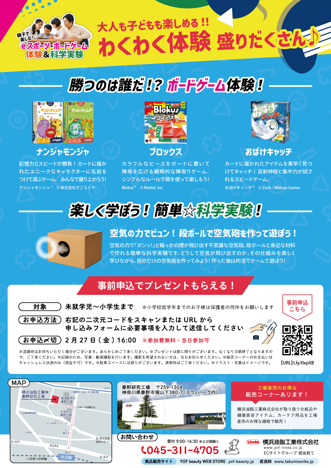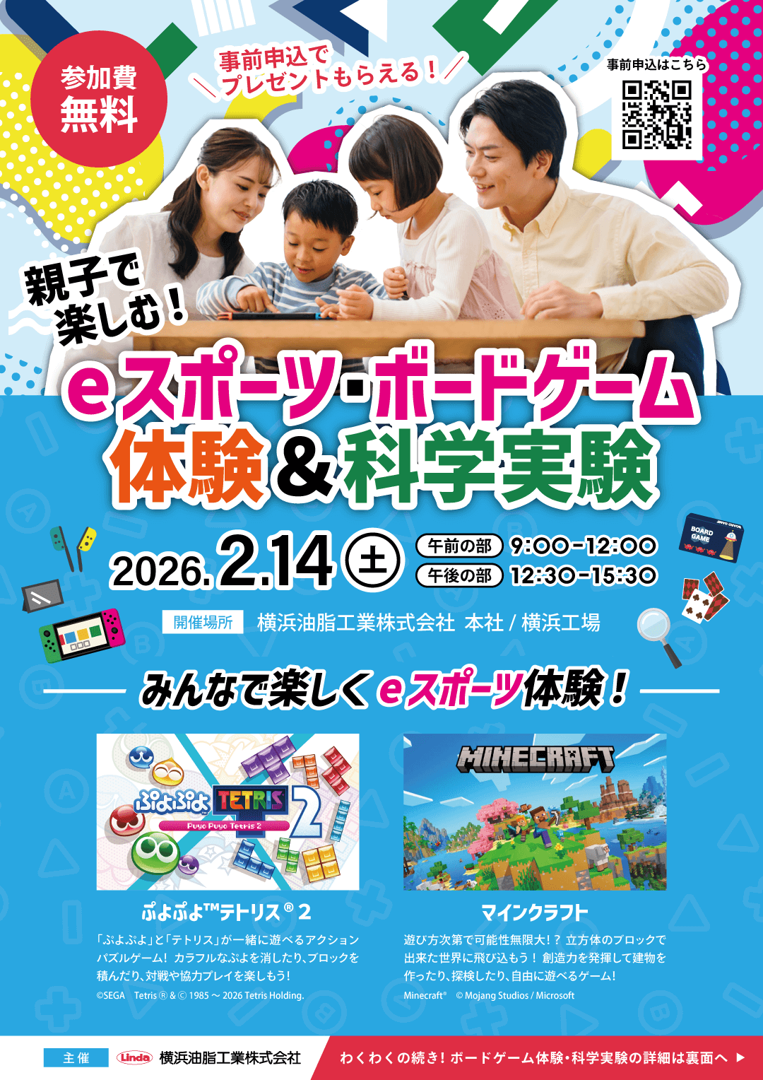横浜油脂工業本社/横浜工場では、秦野研究工場ではに、eスポーツ・ボードゲーム体験&科学実験を開催いたします。