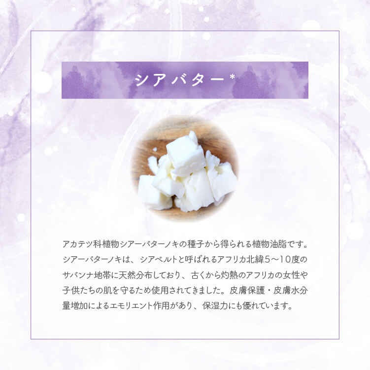 *2 シア脂:エモリエント成分水、セテアリルアルコール、グリセリン、エミュー油、シクロペンタシロキサン、ステアリン酸グリセリル、シア脂、ステアリン酸PEG-100、ラベンダー油、ニオイテンジクアオイ葉油、クスノキ葉油、パルマローザ油、マンダリンオレンジ果皮油、キサンタンガム、メチルパラベン、フェノキシエタノール、水酸化Na